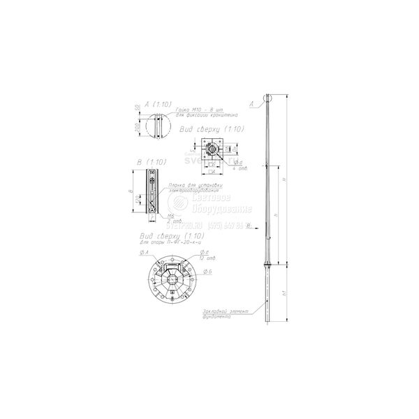 Опора П-ФГ расчитана на подземный подвод питающего кабеля через окна закладного элемента. Для доступа к оборудованию имеются ревизионные лючки.